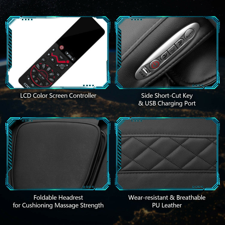 ● Negative Ion Generator and Blue-tooth Speaker: This massage chair can produce negative ions to strengthen your metabolism and build up a strong body. 3D digital audio design links with your smart devices and introduces soothing music and audio reading during the massage. And you can select those functions through remote control with LCD color display or the shortcut key on one side of the armrest.